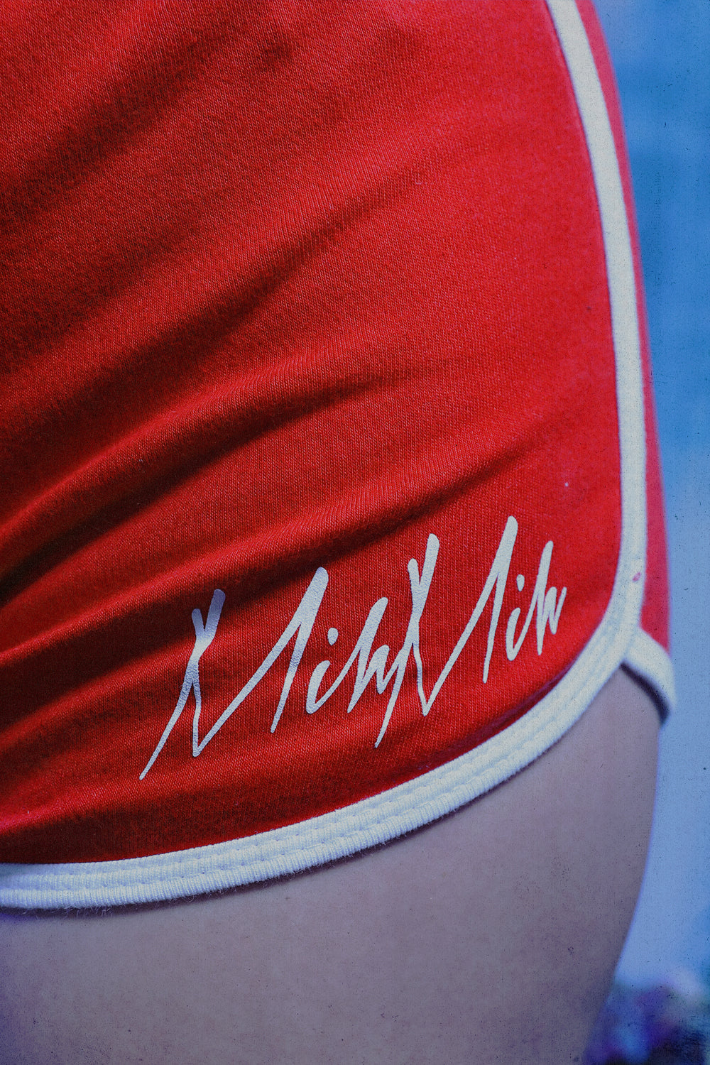 Red cotton shorts with white trim. MihMih print small on the front and Wait On It large on the back of shorts.